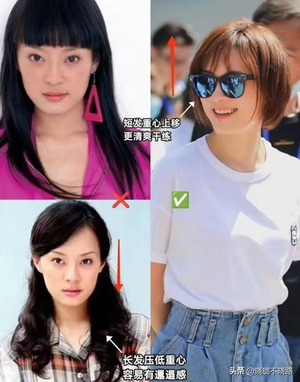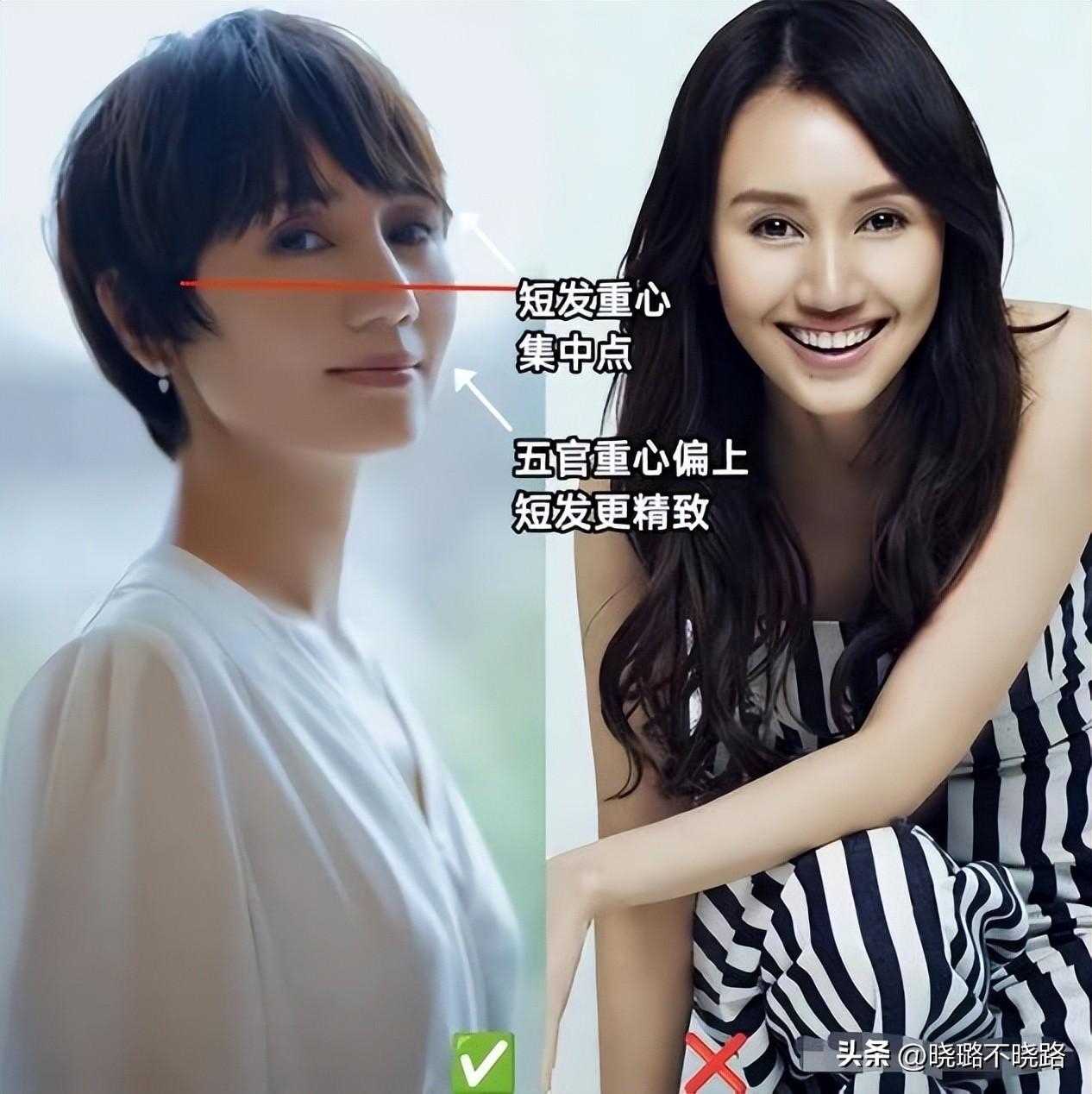 如果大家拿不準自己到底適合長髮還是短髮,那麼可以照着鏡子看看自己的五官,尤其五官的特點和比例。五官比較精緻、整體留白比較少的時候,換成短髮會更加合適。比如袁泉就不適合留太長的髮型,長髮反而會將它的重心集中在鼻子和嘴巴附近,讓五官看起來更加分散,面部看起來更長,但換成短髮後使得五官更加緊湊,看起來更加優雅精緻。