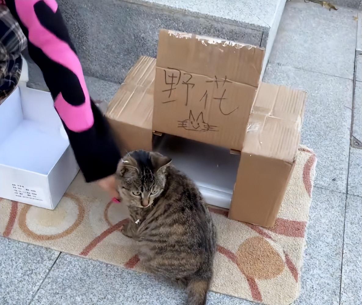 第二天,小姐姐開門看見小狸花還沒有走,顯然是把這裏當家了。小姐姐也十分大方,再次爲它添置了食物,並拿來貓玩具給它,最後饒有興致地給它取名“野花”。