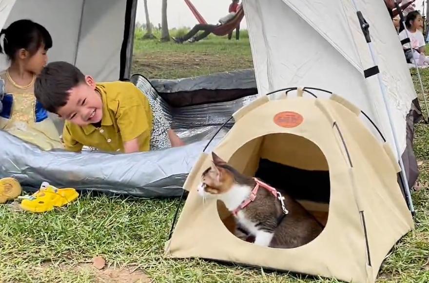 隨着時間的推移,孩子和小貓的感情越來越好,對它的偏愛也越來越多。比如外出野炊時,不僅孩子有帳篷,小貓也有自己的小窩。