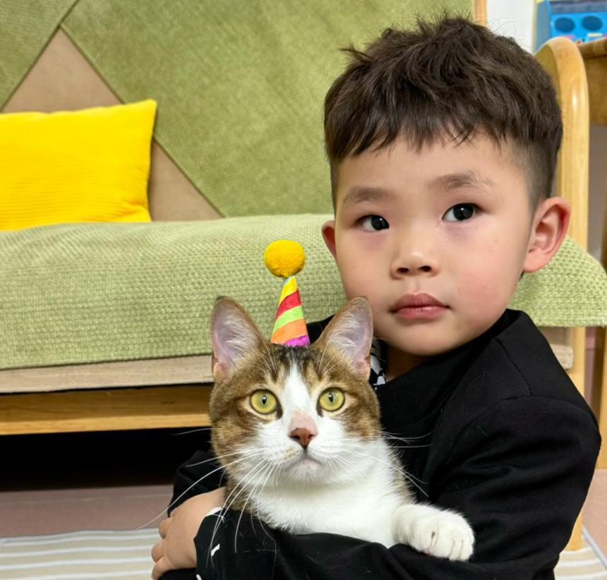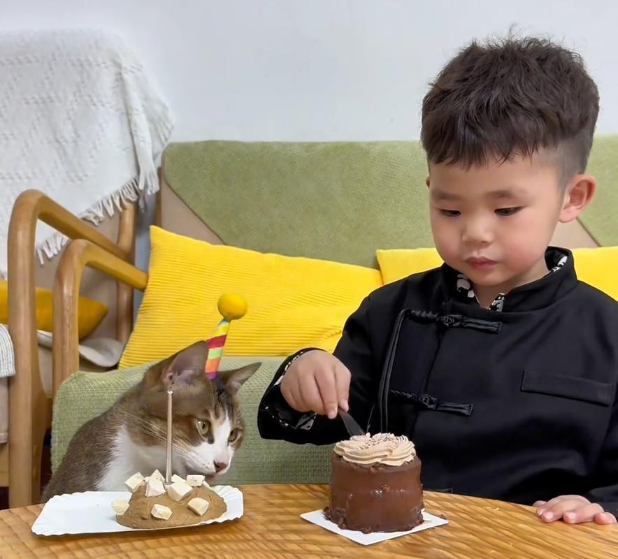 在家喫飯時,男孩會從貓糧裏給噔噔挑最好的給它喫。就連過生日,一人一貓都有自己的小蛋糕。