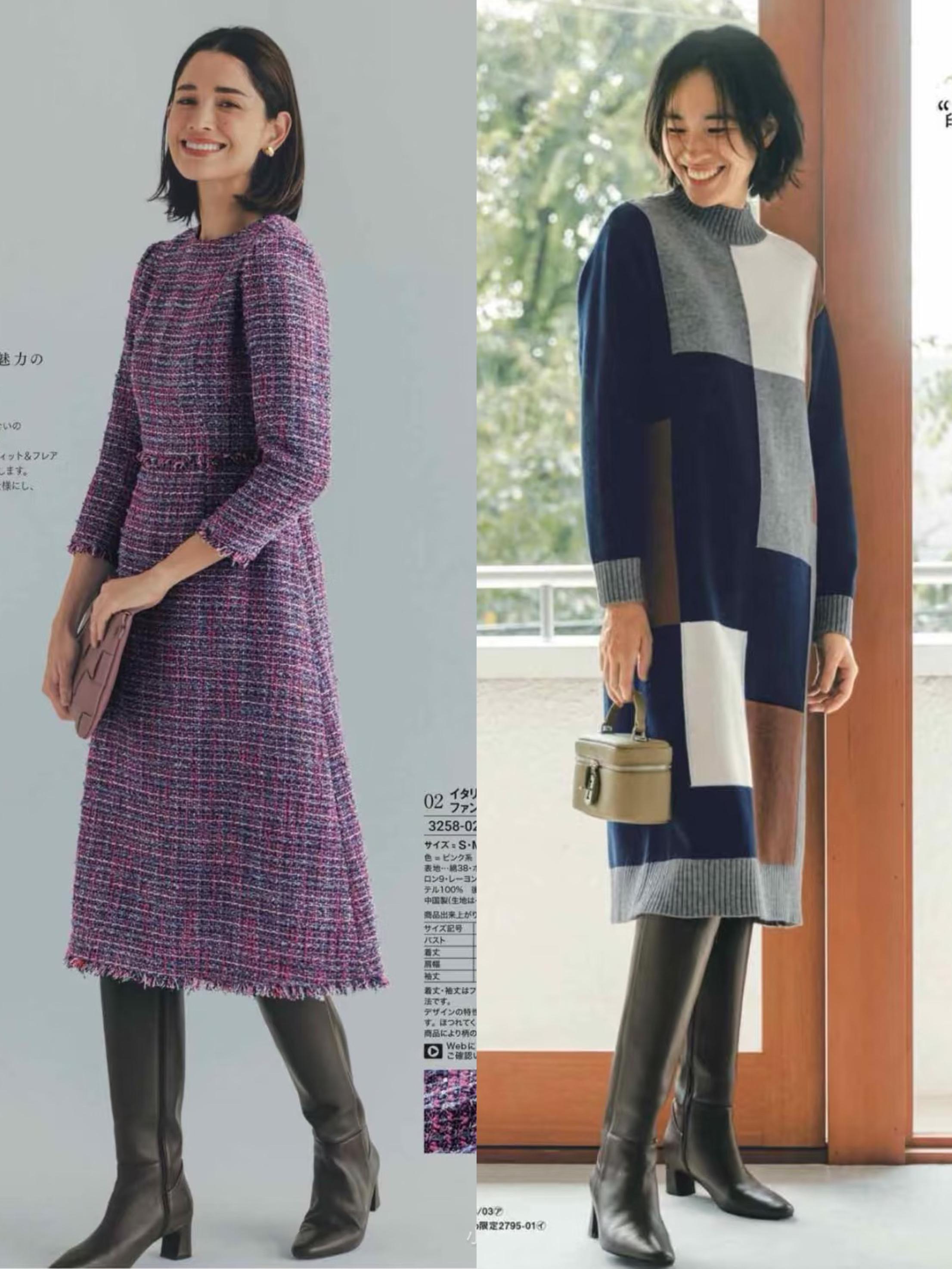 比如修身的黑色連衣裙,搭配毛呢面料、厚實防風。黑色毛呢連衣裙,配上棕色的長靴,就有一種很溫柔、也表現氣質的美。