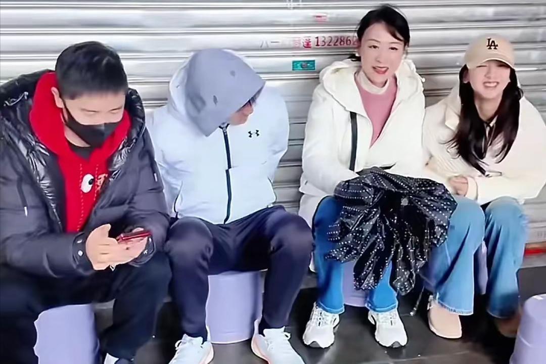 就在路邊上的一個捲簾門下,放着幾個塑料板凳。田亮找到了老闆指着的位置,一家人的表情還蠻逗的。