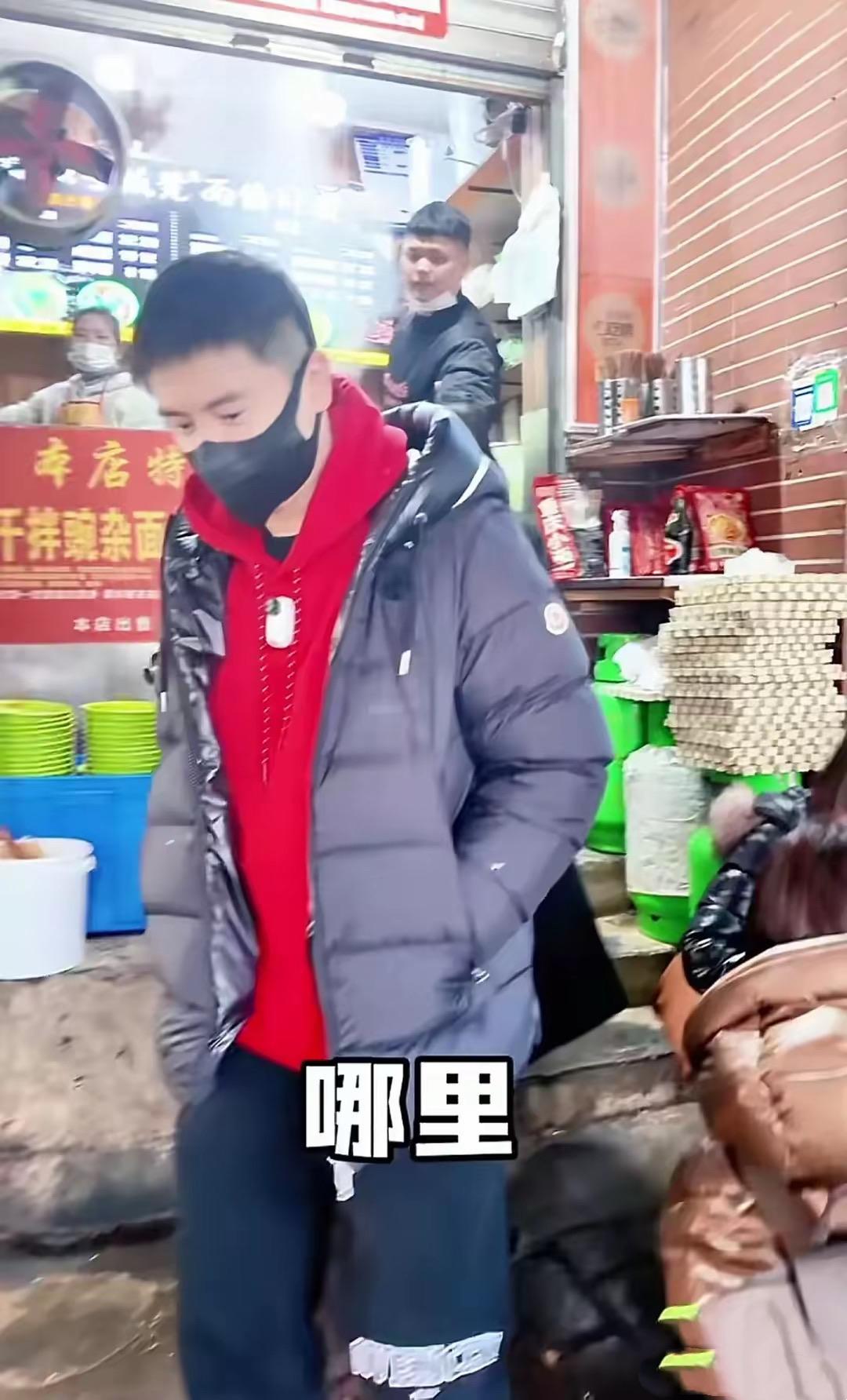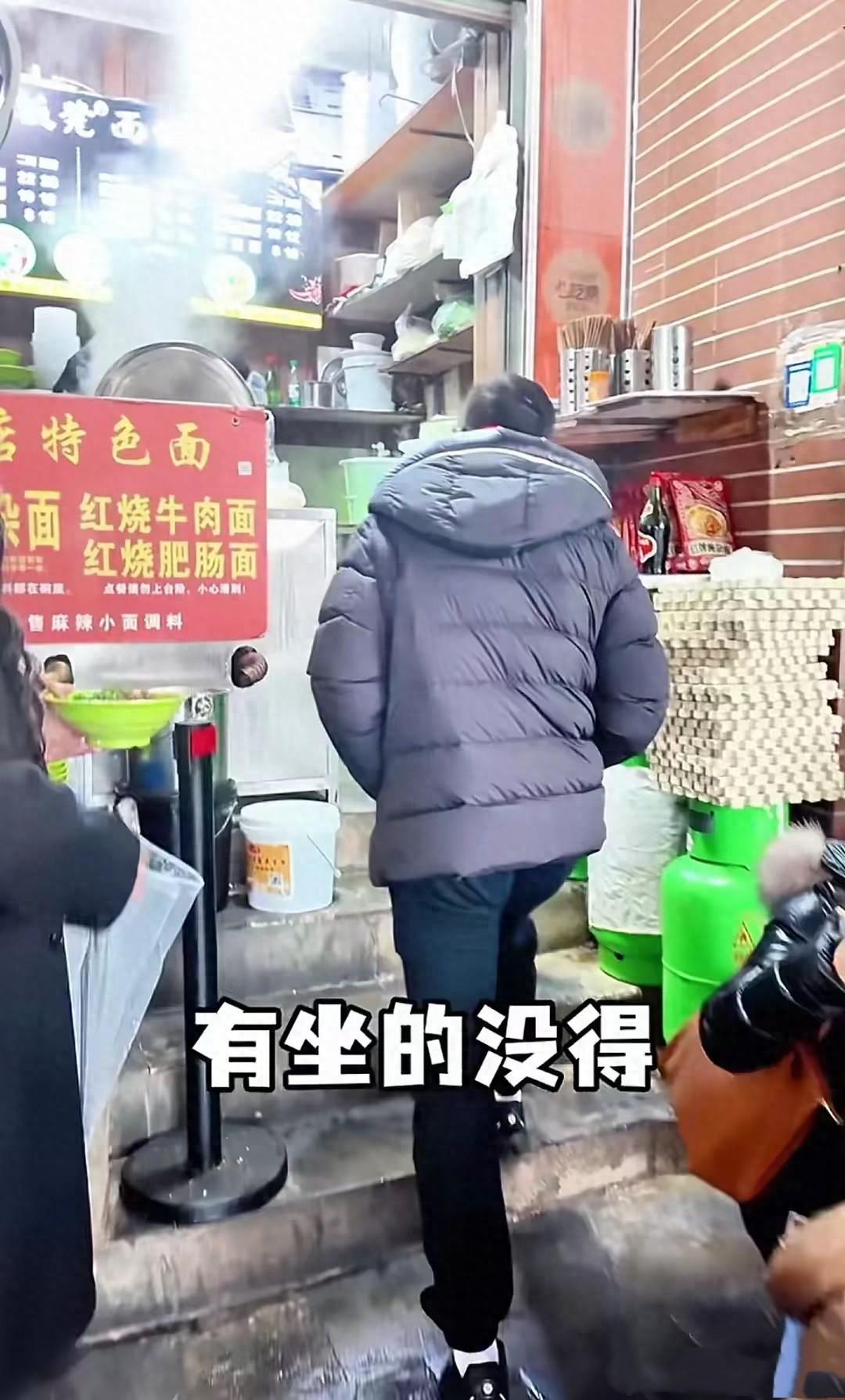 田亮操着一口重慶話,問店裏的老闆:有坐的沒得?結果被告知沒有座位,想要喫麪的話可以坐到街邊上。
