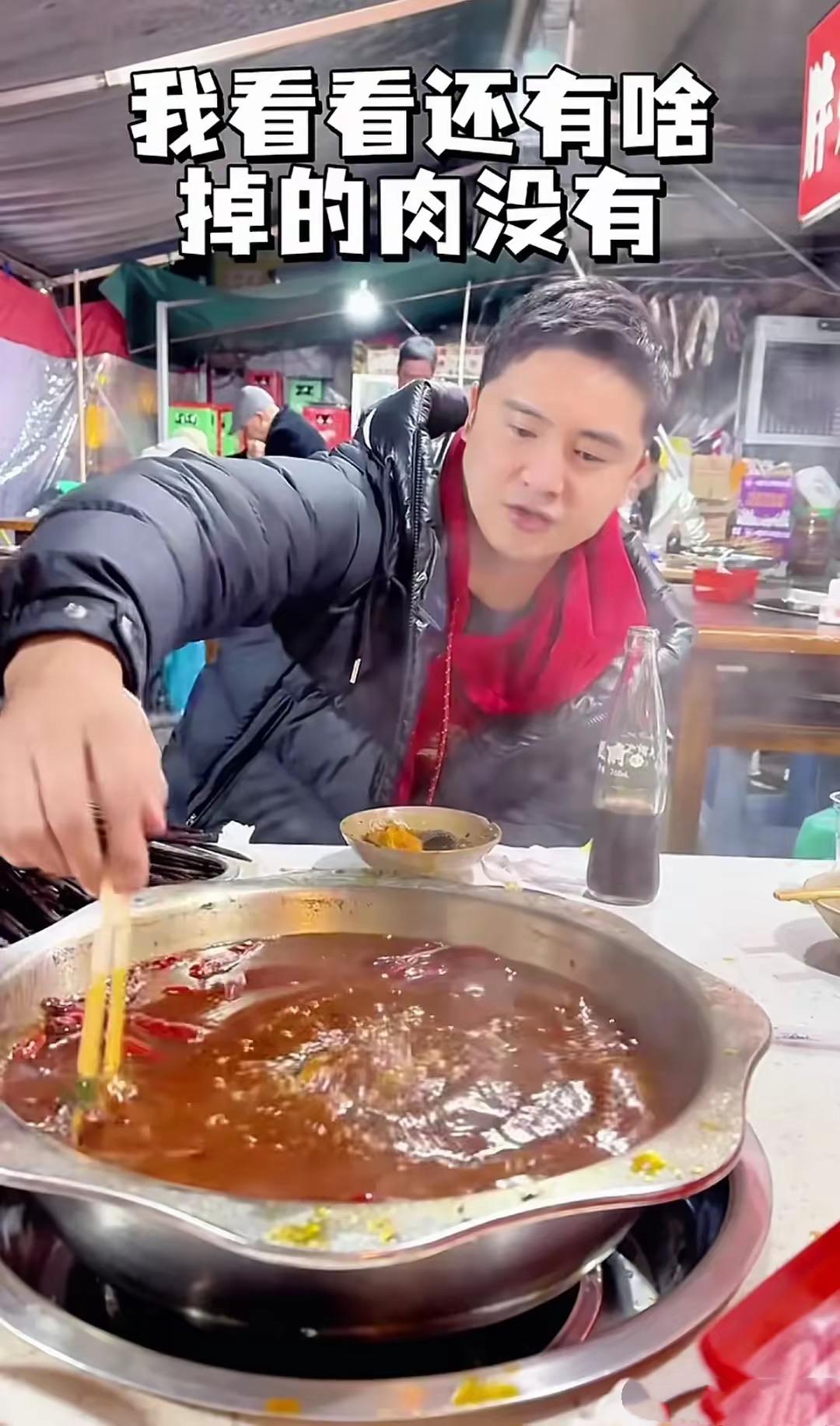 喫完之後,田亮意猶未盡的模樣,拿着褲子在鍋裏扒拉,想要看看還有沒有掉的肉。像極了我們喫火鍋到最後,用漏勺撈肉的模樣。