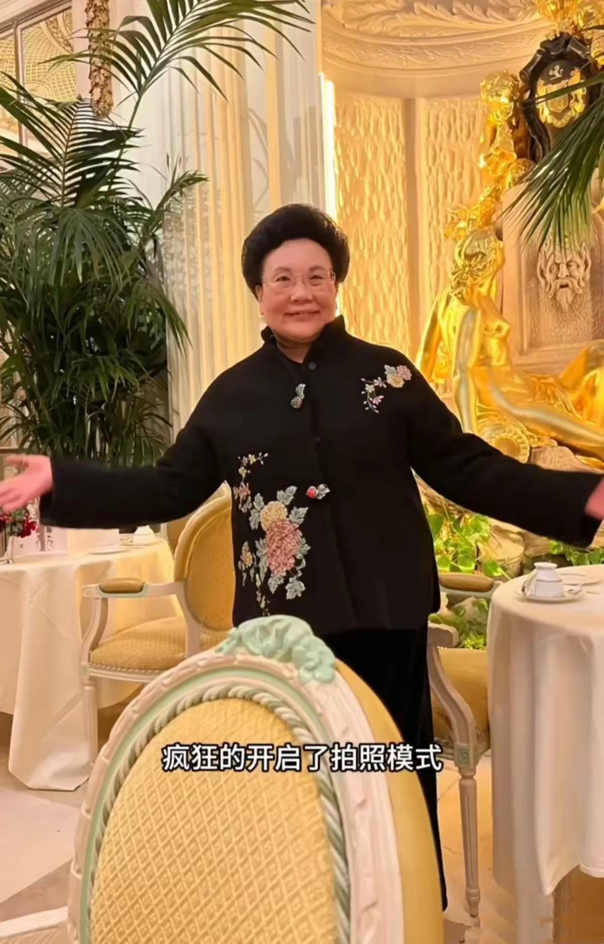 伊能靜婆婆穿了一件新中式的外套,絲絨面料、刺繡印花的點綴,簡單高級格外顯貴。在華麗的背景下,婆婆不停的拍照。