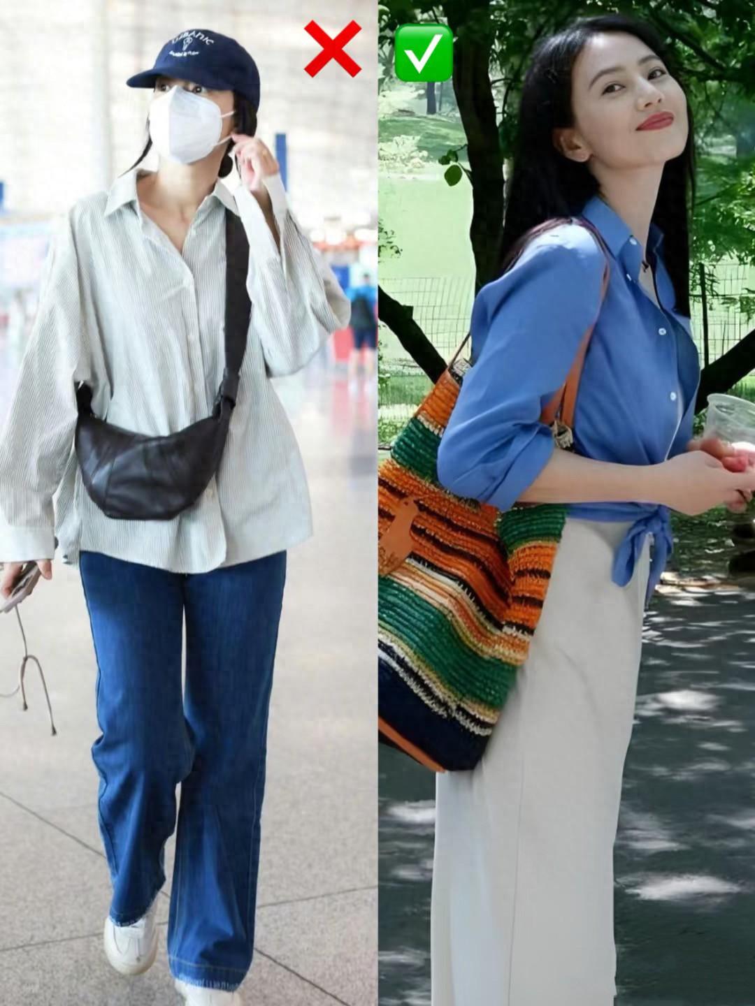 高圓圓穿着深藍色的襯衫,配了比較修身的連衣裙,這樣的打扮就低調又溫柔。相對於淺色襯衫的膨脹感,深色系會更顯瘦。