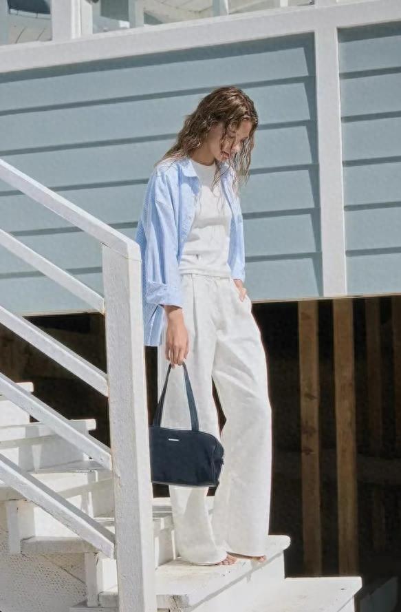 亞麻材質的白色闊腿褲,悶熱的夏天穿起來會很涼快,寬鬆的版型,既能遮掩住腿部的缺點,還帶着幾分慵懶的調調,很適合夏天度假出行的時候穿,上衣配純色t恤,或者是這種帶點細節感的條紋襯衫,簡繁的組合就更時髦了。