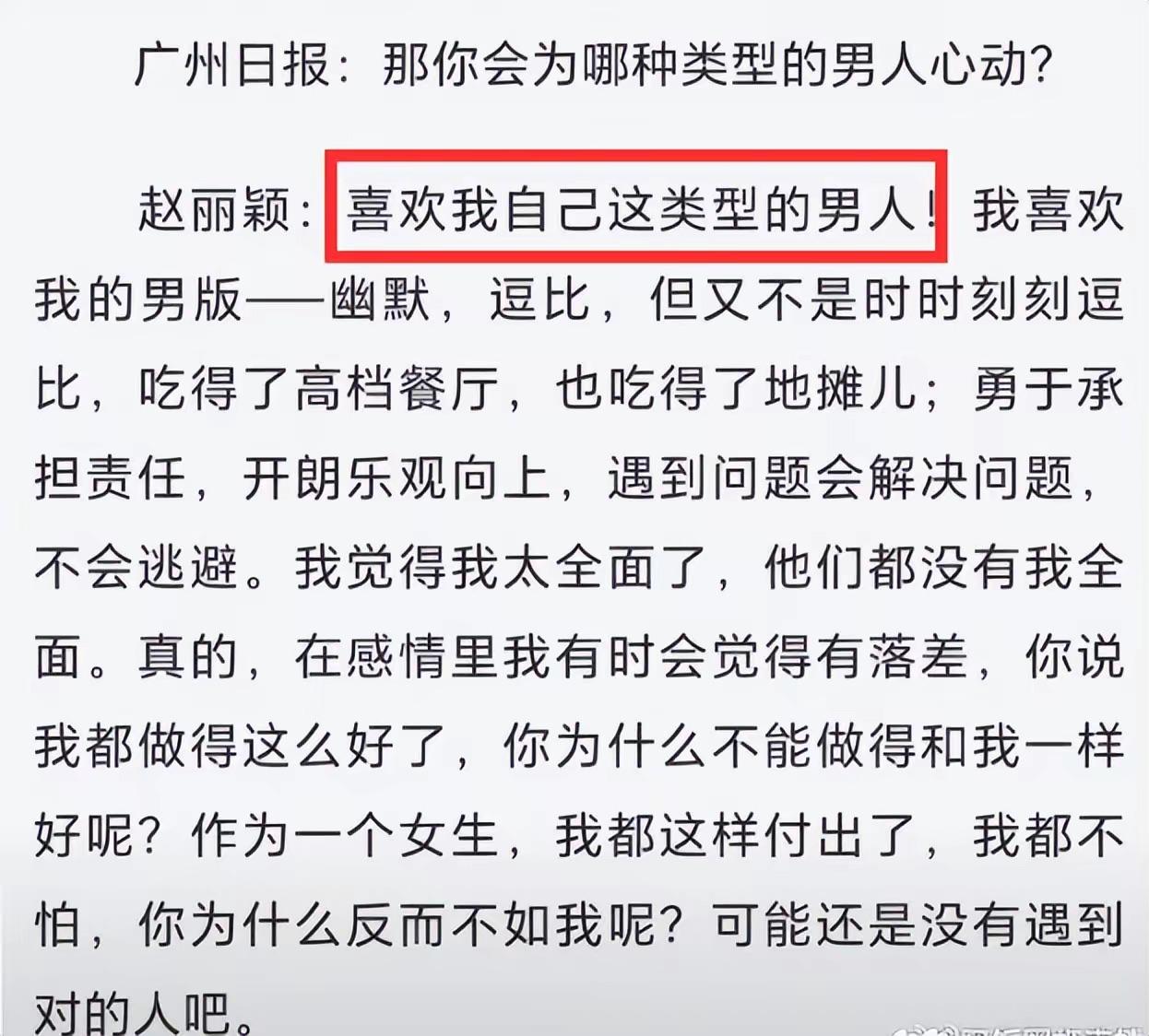 其實趙麗穎在接受採訪的時候,表示喜歡的是我自己這類型的男人。幽默、逗比,喫的了高檔餐廳、也喫的了地攤。