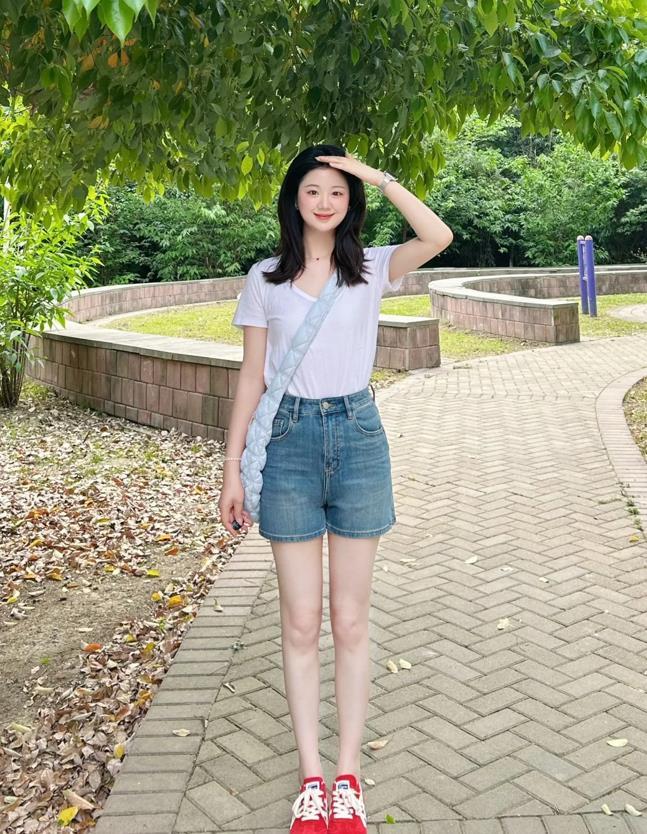 夏天的穿搭,簡簡單單就好看,這是屬於初夏的短褲搭配,簡單的白色v領t恤,搭配牛仔短褲,怎麼看都給人活力滿滿的氣息。T恤材質很薄,微透,穿起來可顯瘦了,褲子是淺藍色的,非常符合春夏的調調,穿着很舒服,搭配上一雙小紅鞋,復古氣息直接拉滿。