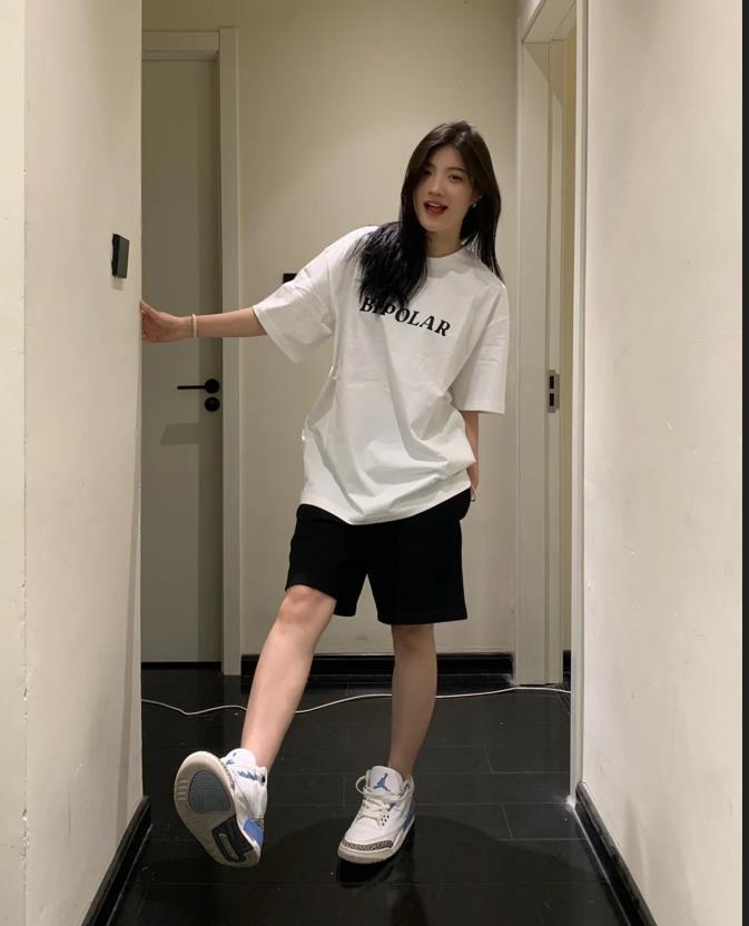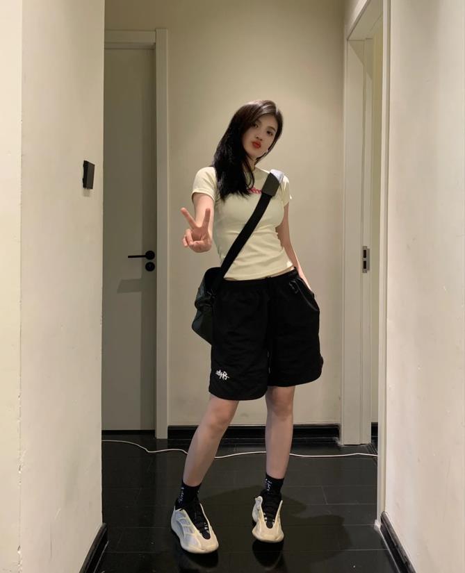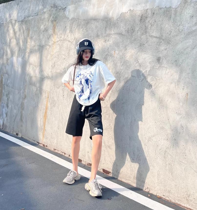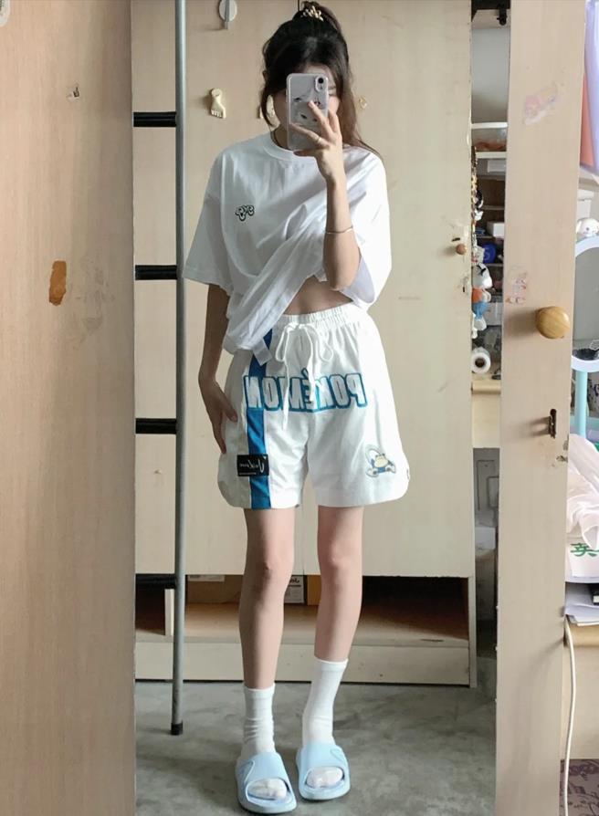 這身穿搭我是真的很喜歡啊,不管是居家還是逛街都妥妥的,白色+藍色的運動短褲,真的太適合夏天了,選擇一件白色短袖t恤來配,甜酷感十足,哪怕是隨便穿上一雙拖鞋都很不錯呢!