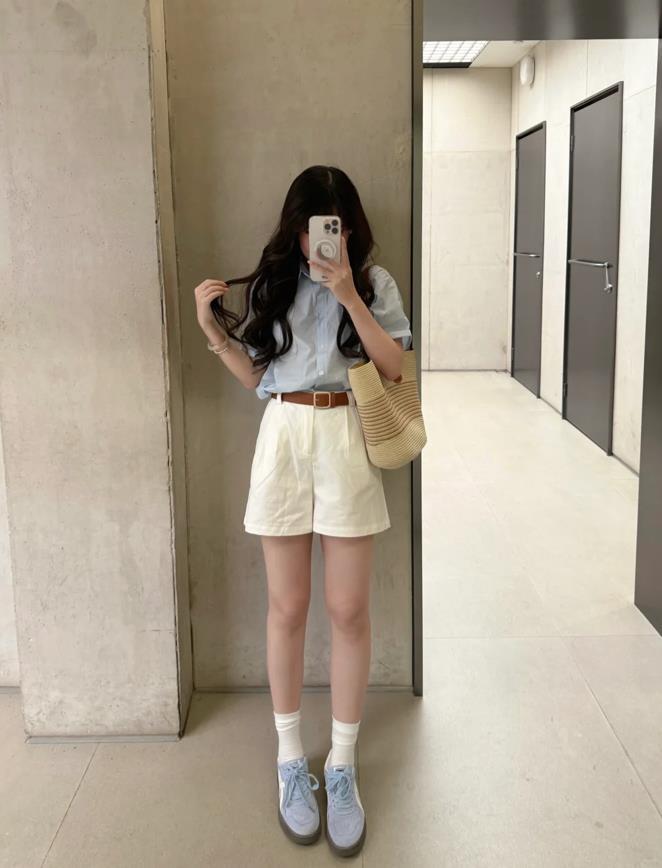 很舒服的一套夏日通勤穿搭,感覺不需要多花心思去打扮就很好看,夏天穿中短褲比修身的短褲更舒服,韓裏韓氣的,淺藍色的短袖襯衫+白色牛仔短褲,腰間增加一條腰帶修飾,把腰身襯托得更纖細了,腳下穿一雙藍色運動鞋,輕鬆呼應了襯衫。