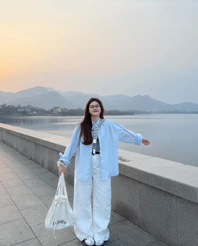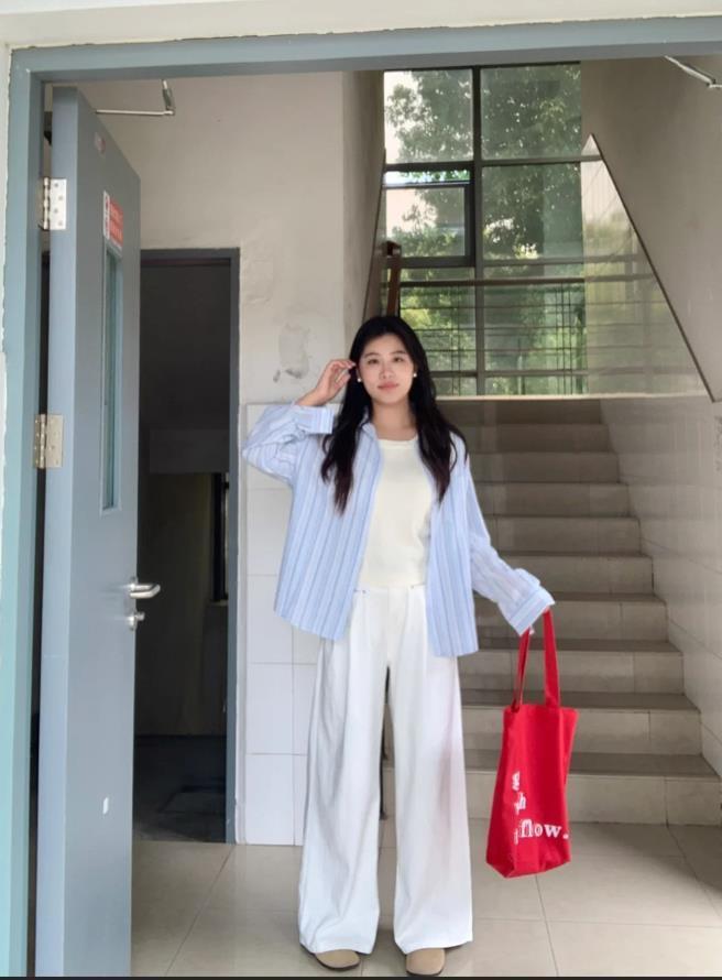 這一套我真的願稱它爲平價顯貴且氣質的穿搭,整個配色瞧着也太乾淨了,藍色+白色的組合可以把整個人襯得很乾淨,藍色短袖襯衫飽和度不會太高,但又能展現出一絲活力感,穿膩了純色款,就可以試試這種款式,搭配版型寬大的白色闊腿褲,超舒服的,遮住大屁股和大腿粗的問題。