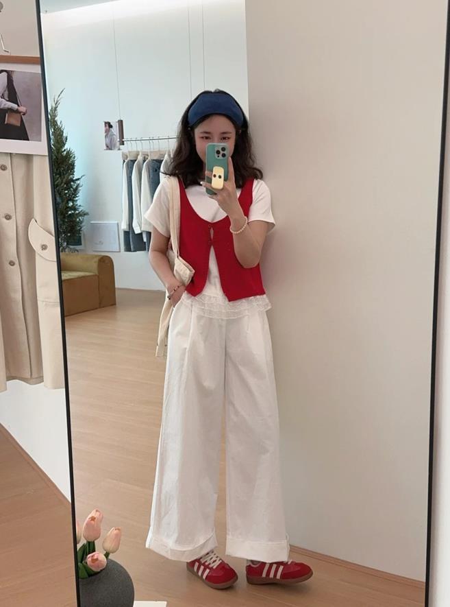 如果是小個子女生,在選擇白褲子時,一定要注意下面料的挑選和長度選擇,九分的更合適,闊腿九分白褲子,搭配白色短袖t恤,原本是比較單一的造型,卻因爲疊穿了件紅色馬甲,以及腳下配的紅色運動鞋增加了亮點,太吸睛洋氣了。