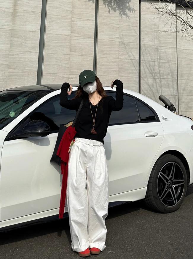 這真的是一套很酷颯的出街穿搭look,黑色上衣配顯腿長的白色闊腿褲,配色簡單也顯高級,挎在肩上的黑色大包包,不僅豐富了造型,還讓你出行方便了許多,再繫上一抹亮色的紅色圍巾,踩上一雙紅色鞋子,整個穿搭撞色超吸睛,不管是出街還是通勤都合適。