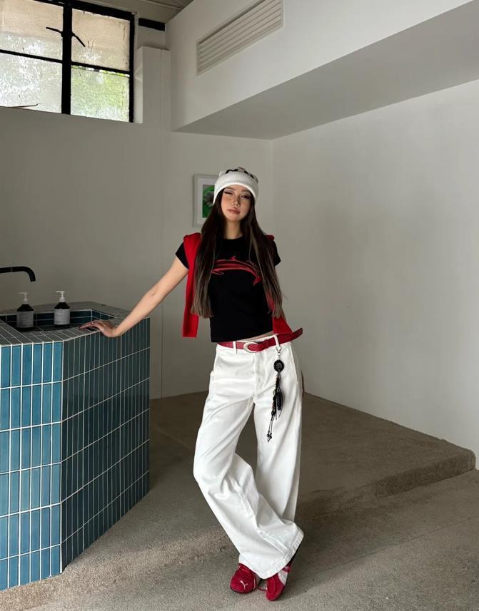 這個夏天,被白褲子安排得明明白白的,垂墜感十足的白色牛仔闊腿褲,寬鬆的版型,可太顯瘦藏肉了,腰間紅色腰帶和紅色運動鞋,兩者進行了呼應的同時,又對整個着裝進行了提亮,哪怕上衣配了黑色t恤,也不用擔心會顯沉悶的。