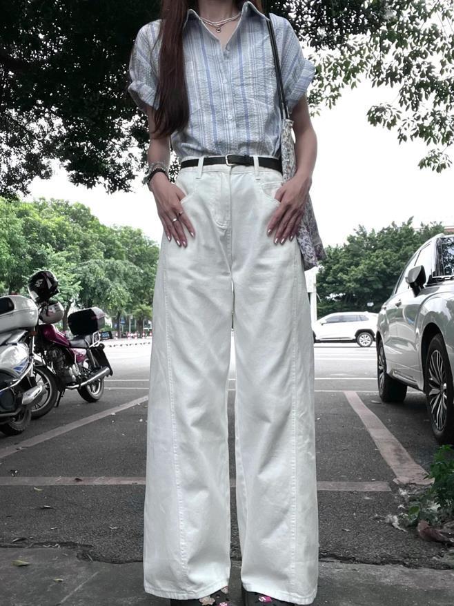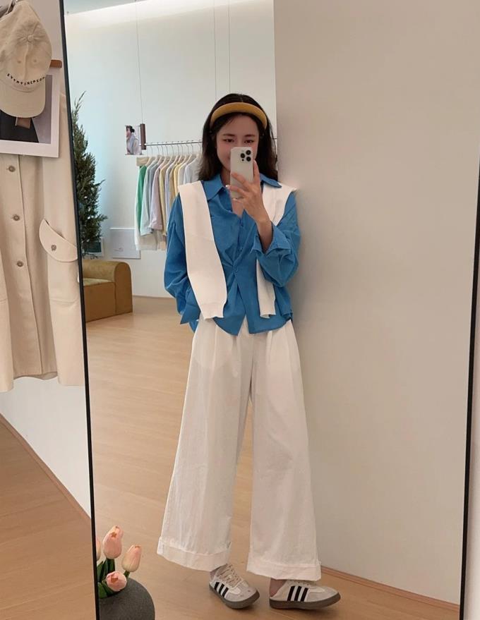 這樣的白色闊腿褲,除了配短袖t恤之外,也可以選擇襯衫來配,湖水藍的襯衫,與白色褲子搭配一起,整個配色看起來就太清爽乾淨了。襯衫的紐扣不要按照規矩的系法,可以嘗試交叉系法,這樣更能打造出細節感,白色披肩的裝飾,提升造型層次感,又時髦。
