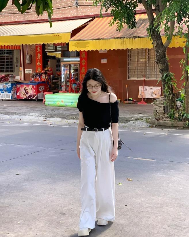 黑白配的穿搭,好像無論在什麼時候都不會過時,也時髦耐看,黑色露肩短袖上衣,基礎簡單的款式,能輕鬆打造出高級感。選擇白色牛仔闊腿褲來配,腰間還增加了一條黑色腰帶點綴,強調了腰線,還顯瘦,同時還把腿部線條給拉長了,適合小個子女生的裝扮。