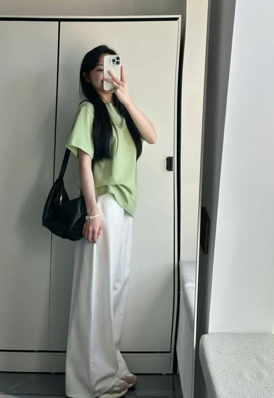 太適合小個子女生的一套穿搭,極簡風十足,夏天穿上這一抹綠色好顯白啊,雖然是極其簡單的款式,但穿起來就是很好看。和白色闊腿褲相配,褲子的面料是冰絲材質的,垂墜感季節,又透氣舒適,版型是寬鬆的,很適合梨形身材的姐妹們。