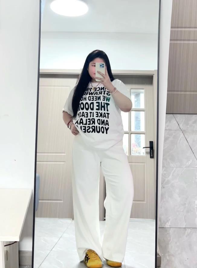 誰說胖女孩就不能穿白色了?選擇白色褲子時,版型記得要選寬鬆一點的,這樣才能更好遮掩住腿部的肉肉,搭配白色印花短袖t恤,同色系的搭配,簡單幹淨又不會出錯,若是覺得過於單調乏味,也可以佩戴一些飾品進行點綴,提升造型的時髦度,或者選擇一雙亮色運動鞋,就能提亮整個穿搭。
