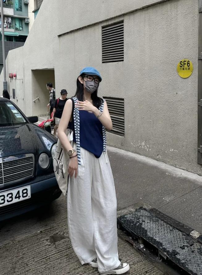 漂亮姐妹們,我說白褲子是一年四季裏最不容易過時且百搭的單品不爲過吧?寬鬆的白色闊腿褲,面料的垂墜感極佳的,穿起來舒適透氣還顯瘦。選擇了一件藏藍色小背心來配,很吸睛的裝扮,如果覺得單調,可以增加帽子、披肩進行點綴,從而豐富整個着裝造型。
