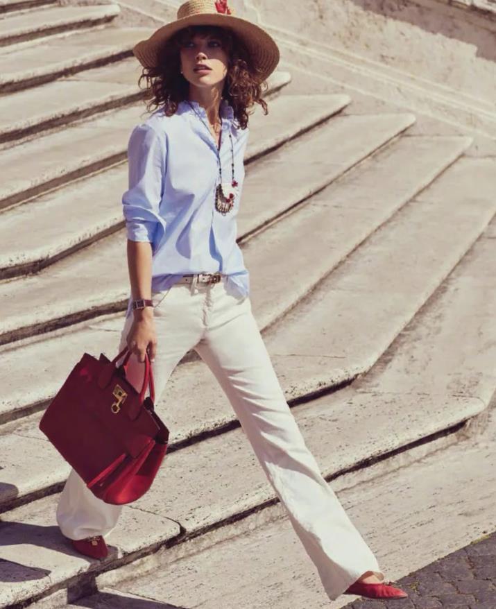 藍白的搭配,那可是非常適合炎熱夏季的,在藍+白的基礎上,再增加一點小面積的紅色點綴,這樣的穿搭看起來就很出挑了,比如腰間增加一條紅色腰帶,鞋子和包包也可以選擇紅色,整個穿搭氛圍感就變得明媚起來。