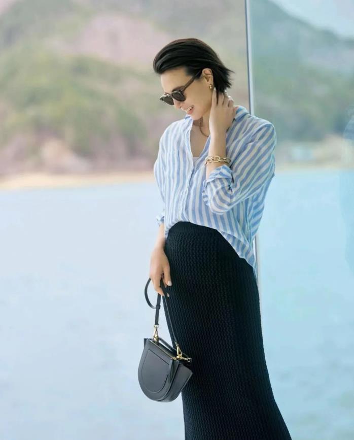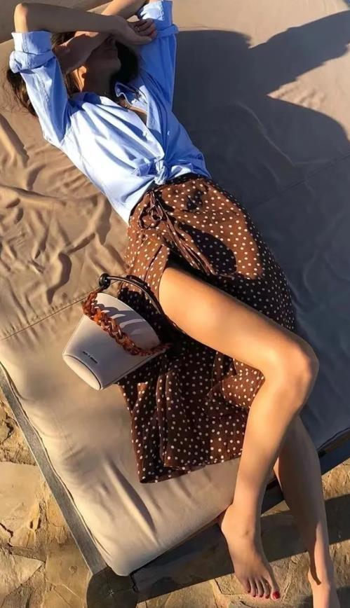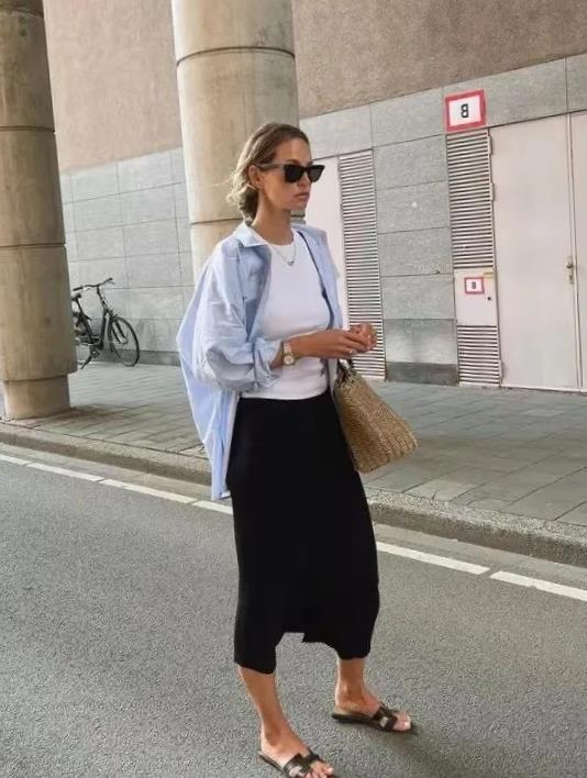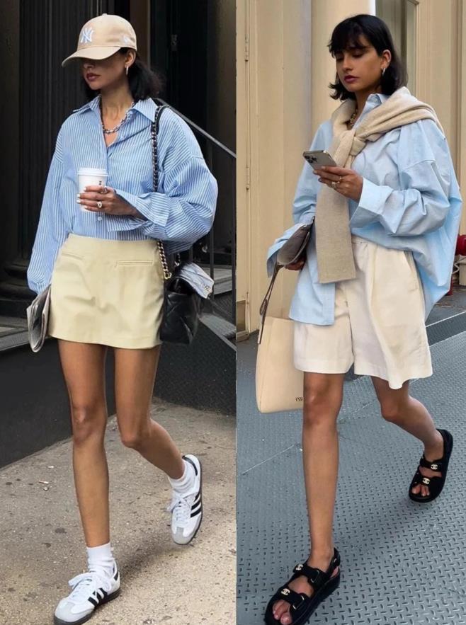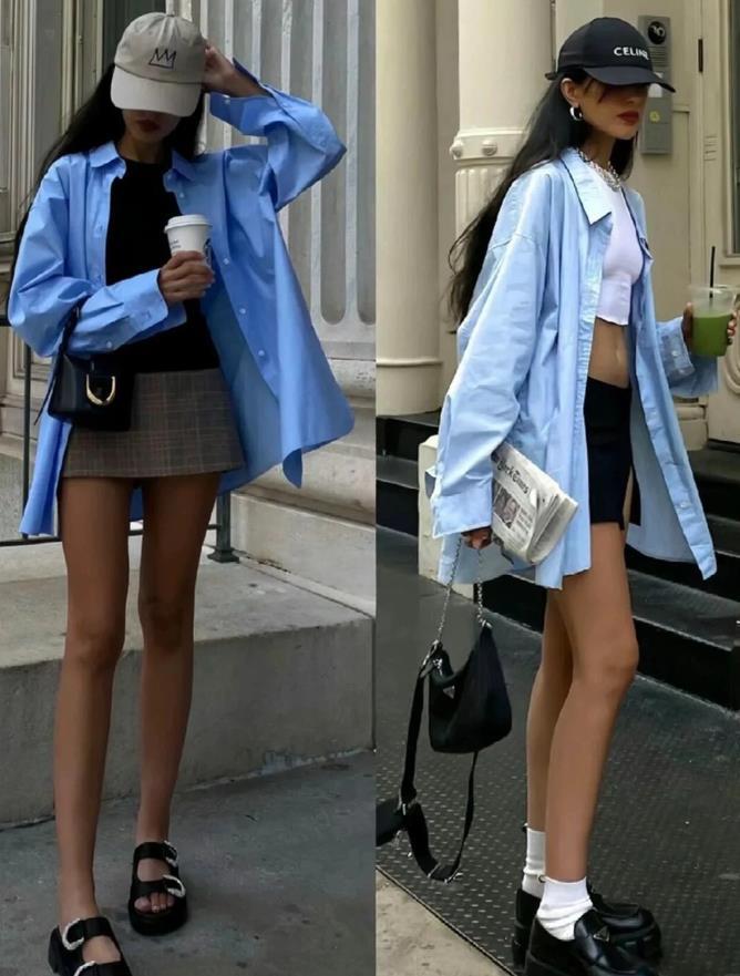 這個夏天,可以將襯衫當成外套穿,特別是水藍色襯衫,太顯清涼和乾淨的色調了,這個顏色對於膚色暗沉的姐妹也友好,內搭背心,黑色或背心都ok。下身選擇一條半身短裙,就這麼露出雙腿來,盡顯大長腿。