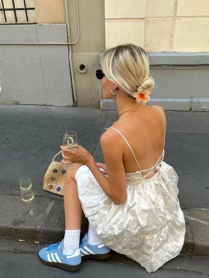 很適合度假出遊的一套裝扮,白色吊帶連衣裙,有好身材的姐妹就不要吝嗇穿了,腳下踩着的水藍色德訓鞋,成功帶來一絲清涼的味道。白色襪子與裙子形成了色彩呼應,增加和諧度又耐看。
