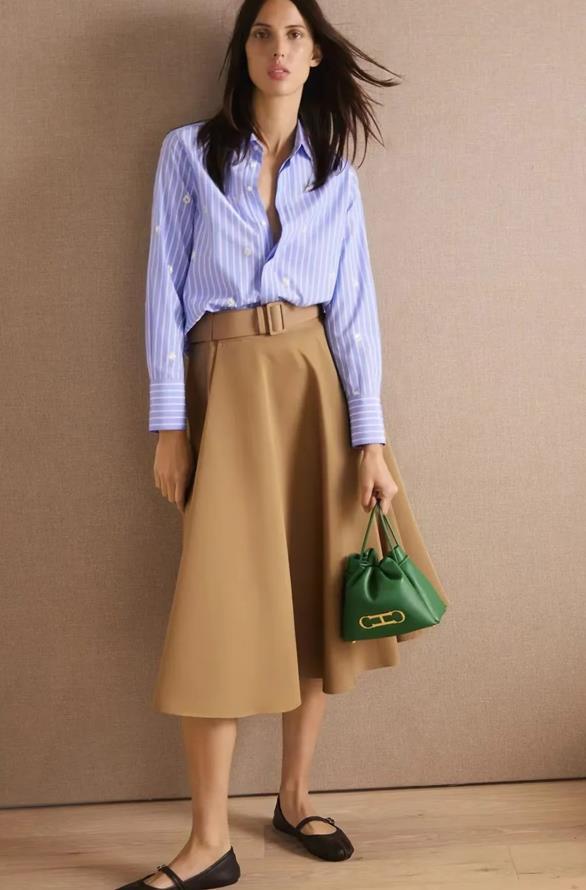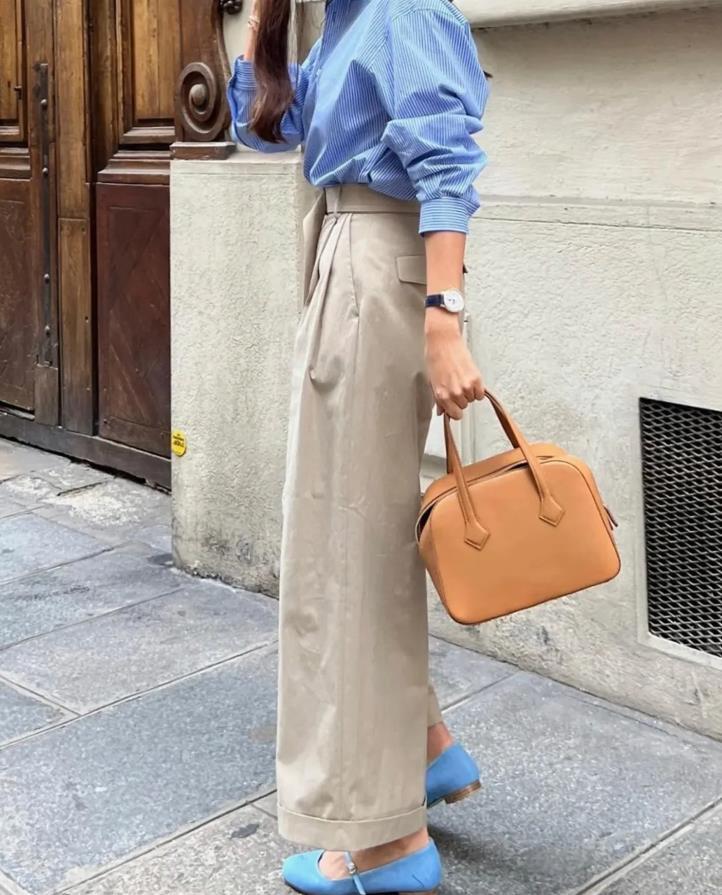 淺淡的卡其色褲子與水藍色襯衫搭配,通勤風十足,記得要將襯衫的下襬扎一點到褲子裏去,這樣整體的穿搭就很顯溫柔氣質,視覺上也十分顯乾淨清爽,很符合夏天的打扮。