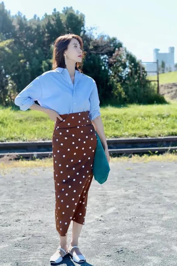 如果你選擇的水藍色飽和度比較低,在搭配的時候,就可以選擇顏色比較深的大地色來配,比如水藍色襯衫+深棕色波點半身裙,色彩上呈現的明暗反差,可以帶來很明顯的對比,整個着裝打扮也變得清新起來。