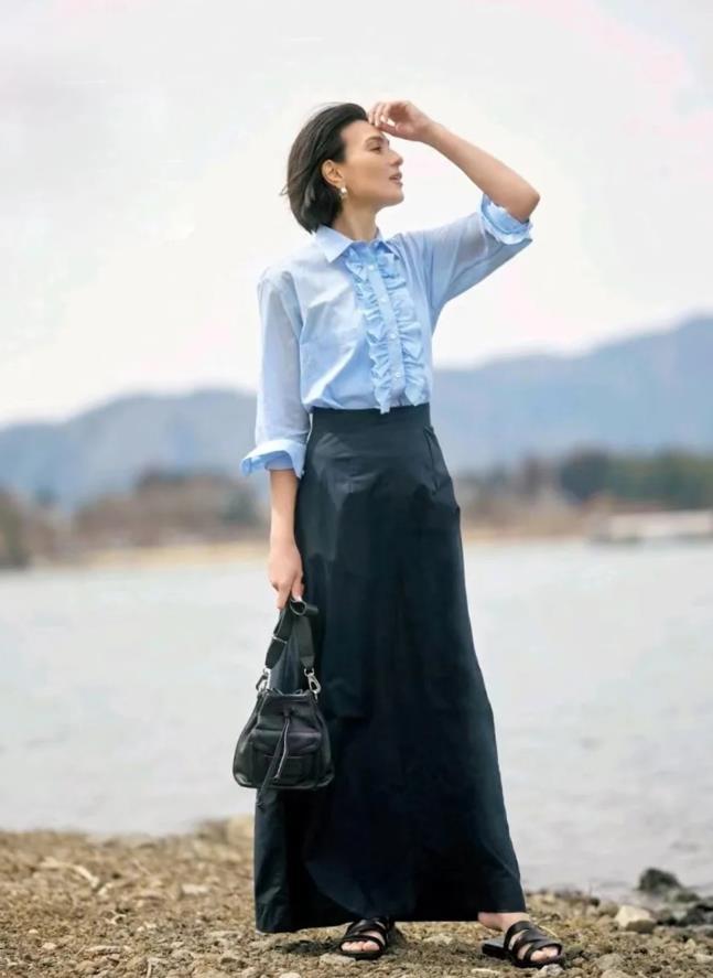 經典的黑色+水藍色,一明一暗,正好形成互補,夏天穿黑色直筒長裙,再配一件水藍色襯衫,這樣就可以減少黑裙子帶來的沉悶氣息,讓你的穿搭看起來更清爽亮眼。