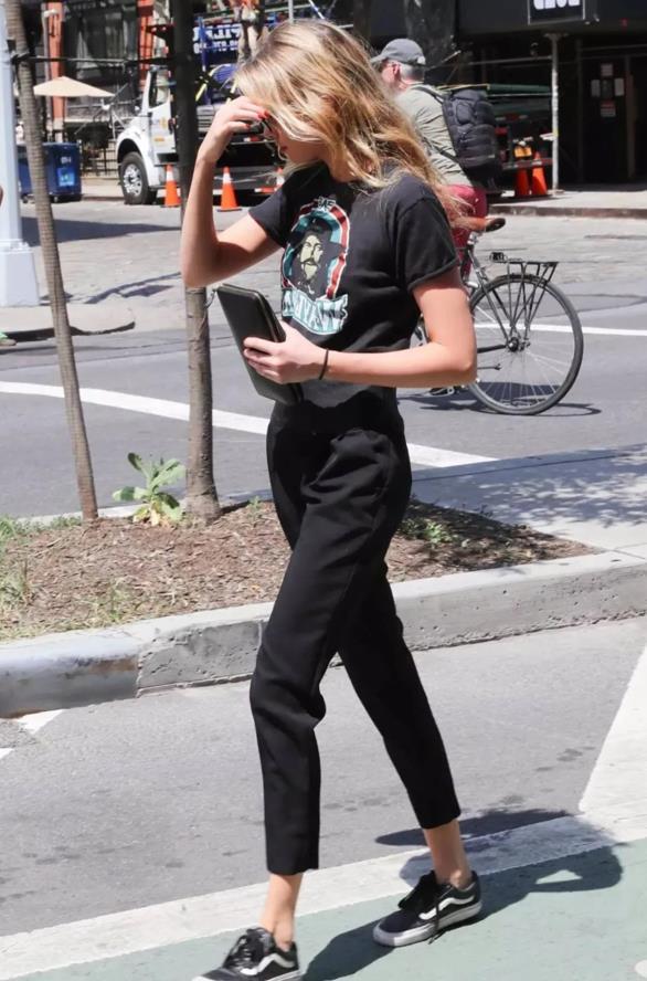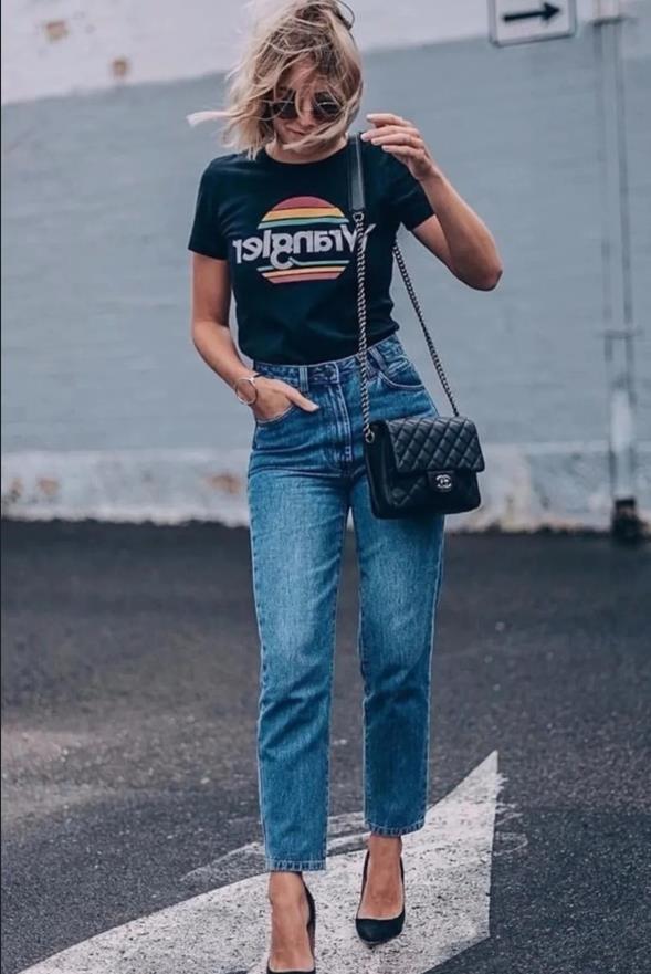 如果覺得黑色t恤配牛仔褲看起來有些偏中性風,那麼就可以在鞋子上做下改變,例如你可以選擇一雙尖頭高跟鞋,這樣就能讓原本過於中性風的造型變得優雅又不失女人味了。