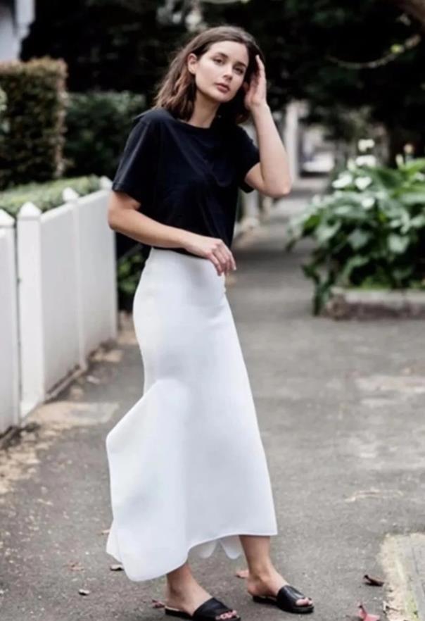 開衩設計的白色包臀裙,顏色上清新明亮,在夏天穿讓造型有“呼吸”感,上衣選擇簡單的黑色t恤,與黑色的鞋子進行了呼應,這一身是很極簡的黑白配,高級優雅,還不失女人味。