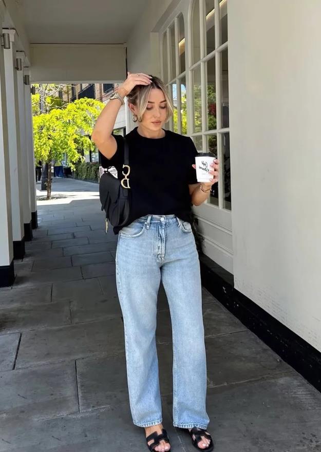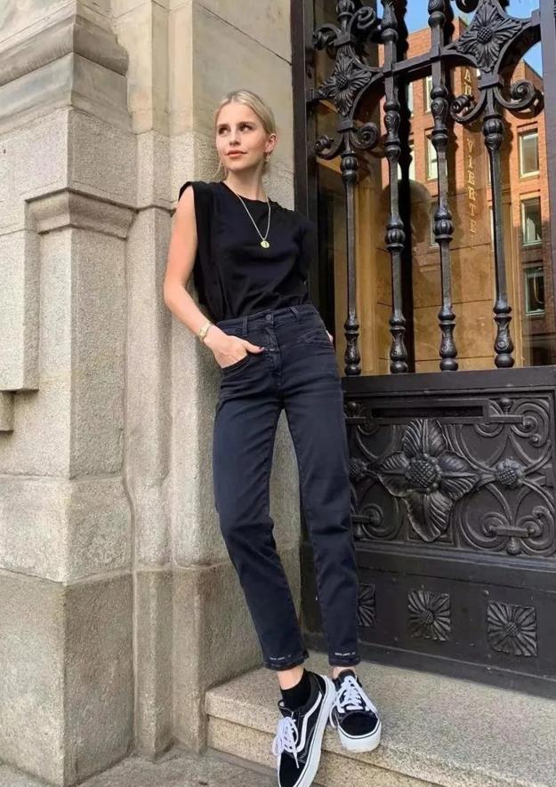 T恤與牛仔褲的組合,主打的就是一個簡單帥氣,黑色t恤可以選擇版型寬鬆點的,再搭配一條淺藍色高腰牛仔直筒褲,將t恤的下襬塞進褲子裏面,整個着裝利落又不失帥氣。