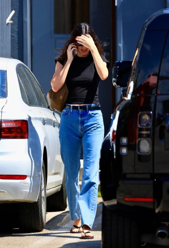 肯豆這一身夏日裝扮,透着一股極簡的時髦,修身版型的黑色短袖t恤,下身配了一條九分牛仔褲,鞋子是一雙黑色夾趾平底鞋,清爽舒適又自在。
