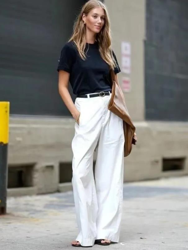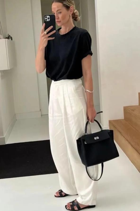 黑色t配白褲子,有種很極簡的風格,夏天這樣的穿搭往往是能打造出高級範的,不知道怎麼配色的女性,都可以參考起來。
