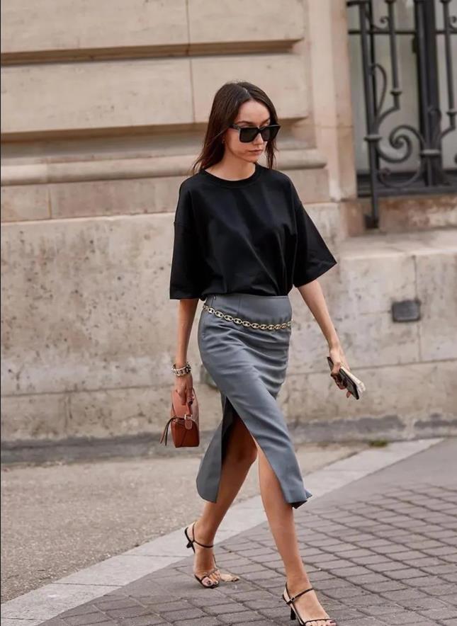 黑灰的配色,無疑是百搭耐看的,黑色t恤與灰色側開衩包臀裙搭配一起,很低調素雅,整個着裝看起來也很大方得體,整體有種很內斂的氣質感,如果想要提升穿搭的時髦度,可以適當佩戴一些飾品點綴,金色的鏈條腰帶,快速提升了穿搭的精緻感,加上黑色細帶涼鞋,夏天的輕盈透氣都有了。