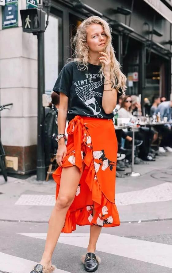 浪漫的印花,可是最能打造度假風的關鍵元素,搶眼的紅色印花包臀裙,與黑色t恤相配,一秒就對整個穿搭提亮了,能瞬間告別穿搭的沉悶感。
