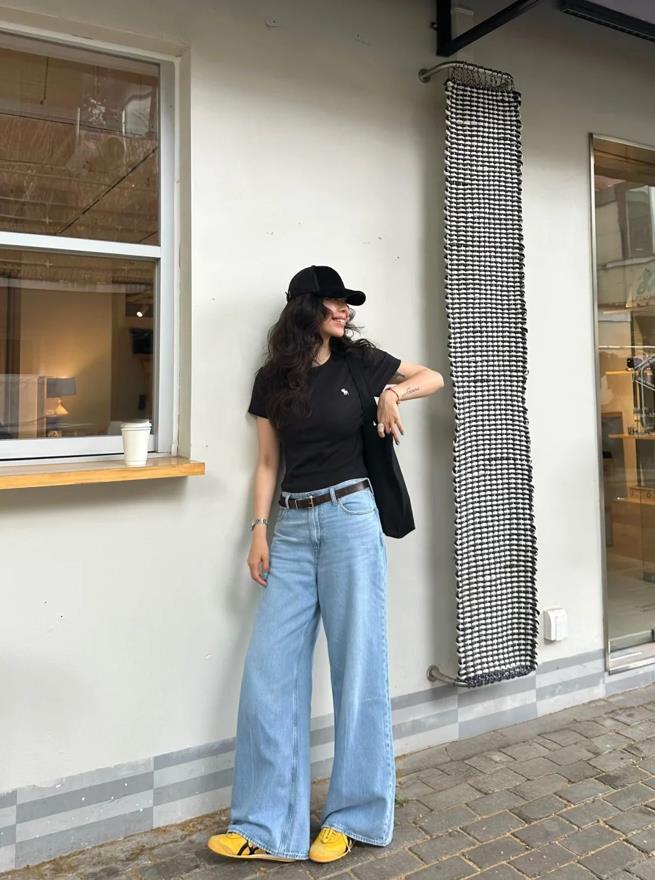 這個夏天,就選擇一件黑色t恤配牛仔褲吧,完全不需要花費腦力來思考的搭配,簡單鬆弛感進行到底,修身卻不會過分緊繃的黑色t恤,軟而不塌的牛仔闊腿褲,腳上那一抹黃色,恰到好處點綴了整個造型,這是一套美式休閒風裝扮。
