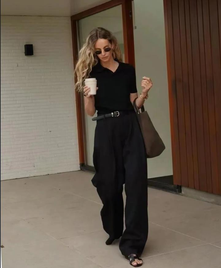 一身全黑色的打扮,給人的感覺就是滿滿的高級,很極簡風的一套,整體既休閒還不失優雅,關鍵是高級感輕鬆拿捏。