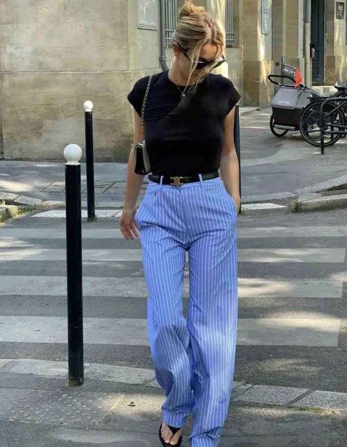 關於黑色t恤的搭配,方法其實有很多,職場的女性們,就可以試着把它與西裝褲搭配一起,換成彩色系的西裝褲就能減少黑色t帶來的沉悶感,比如藍色、綠色,讓你整個着裝的造型配色更加明亮,充滿活力。