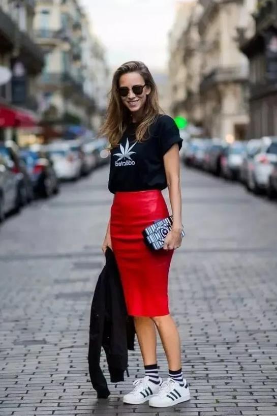 紅色的包臀裙,可謂是洋溢着性感與個性,利用黑色t恤來配,正好可以平衡紅色帶來的過分鮮豔,也爲穿搭注入了活力氣息,再加上一雙白色運動鞋,又增添了休閒清涼氣息,很時髦又減齡的裝扮。