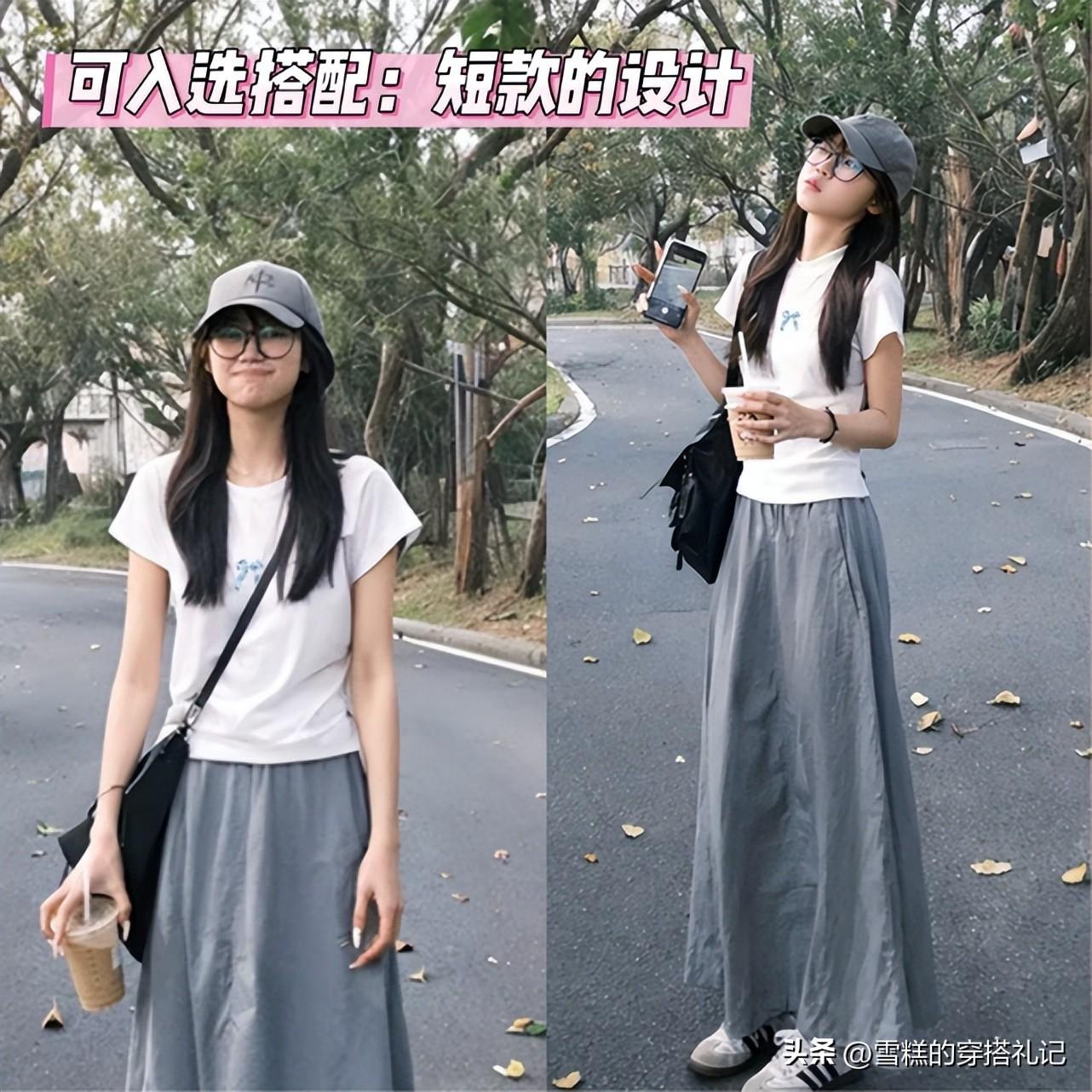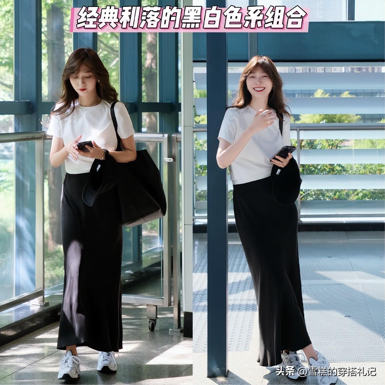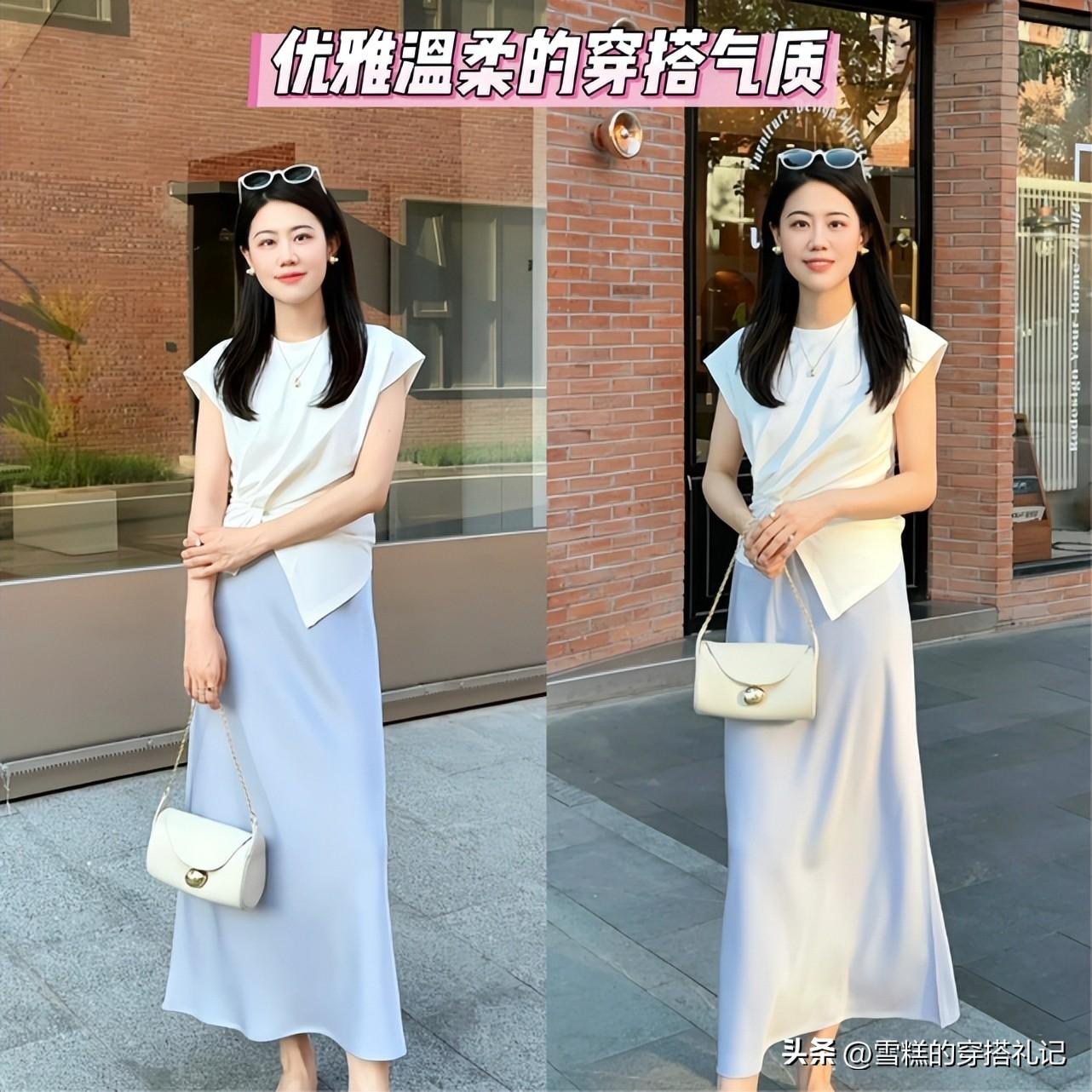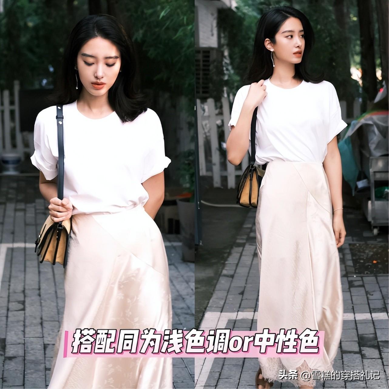 白色系的t恤在春夏當中如果想要展現的更加具有優雅感的話,那麼在這裏提醒各位女性可以結合優雅且高級的長款裙裝與其進行組合搭配,例如像醋酸裙又或者是垂感較重一些的優雅型裙裝,與其進行搭配組合的時候,不管是從氣質還是身形的狀態而言,都非常的好看。