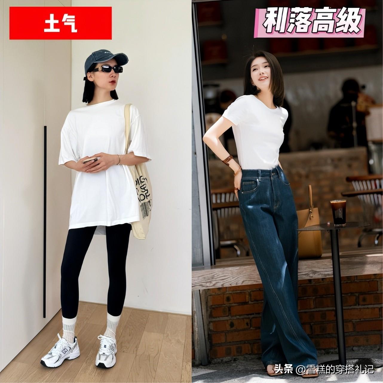 在這一組對比圖當中相信各位女性就可以很明顯的看出來,像常規的白色t恤不會打扮的女人就會選擇打底褲與其進行組合,整體視覺上看起來真的是非常的顯土氣,而會打扮的女人選擇搭配的褲子單品則是直筒的煙管型系列,真的是利落又高級呢。