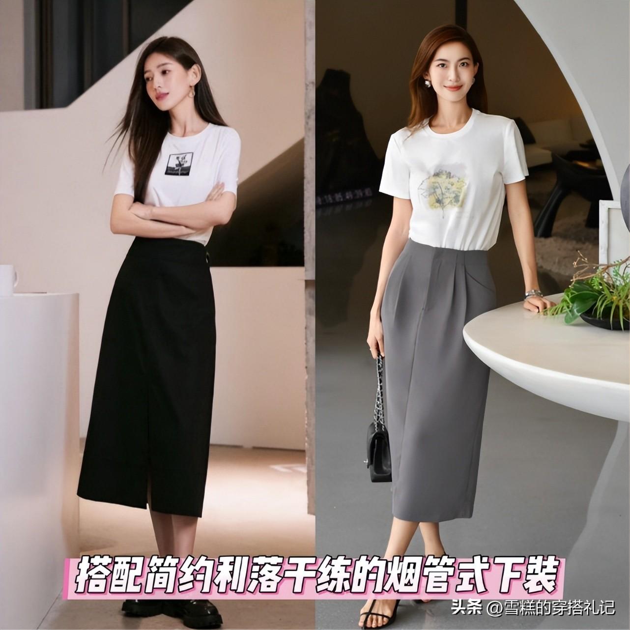 我們下半身的搭配就可以優先於選擇像煙管的長款裙裝又或者是煙管褲這一類的單品了,與簡約的白色t恤進行組合的時候整體氣質而言是非常極具利落和幹練性的,也很適合運用於職場當中的穿搭哦!