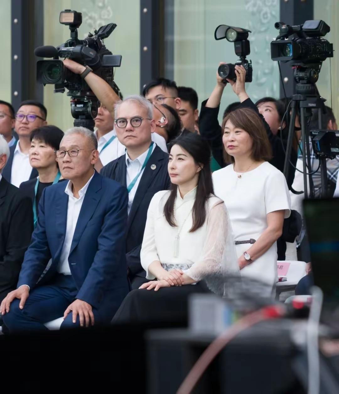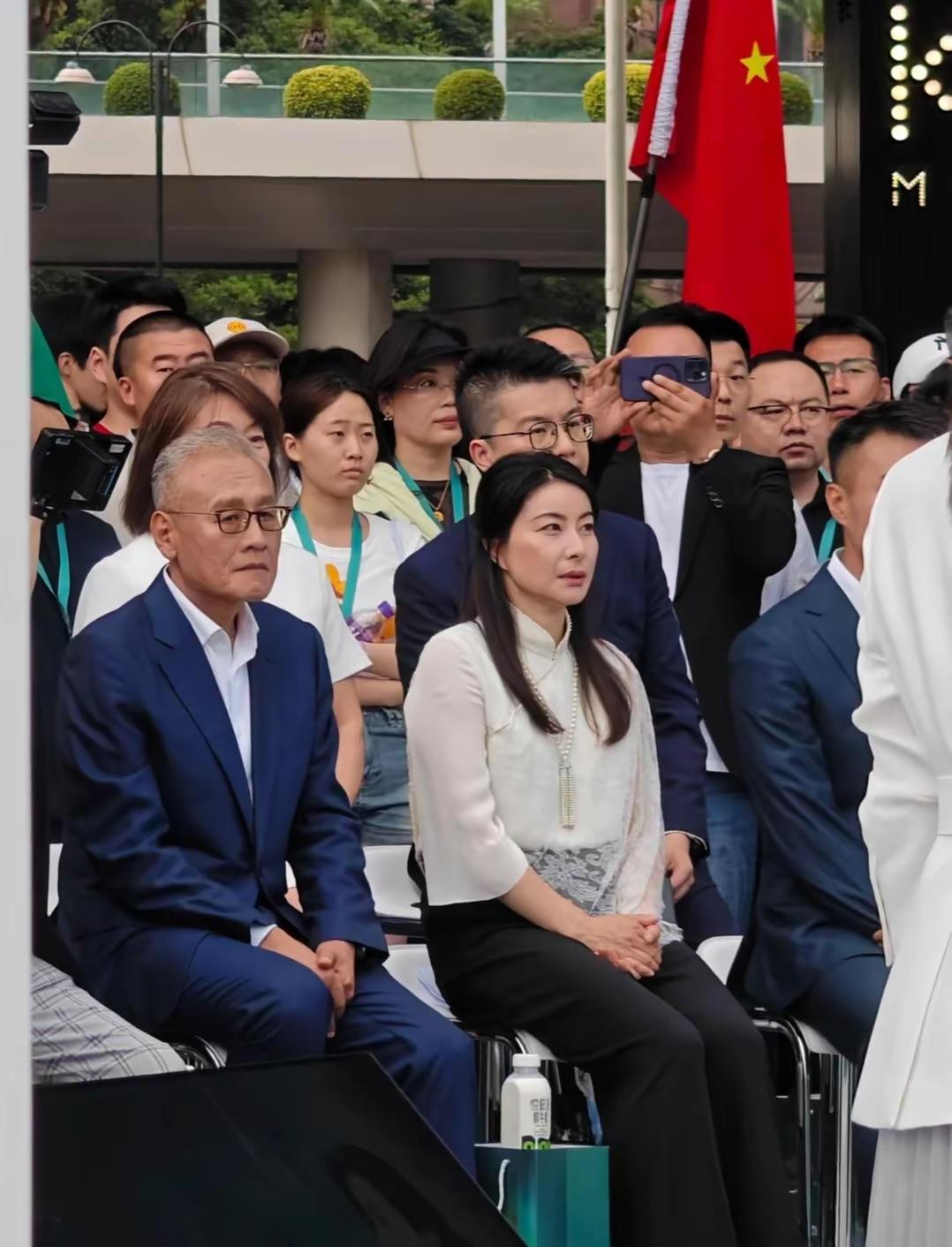 郭晶晶很適合這種婉約又高級的穿搭,她穿白色的新中式襯衫,坐在人羣中美的很醒目。當天郭晶晶梳了一個很好看的半扎發,顯得臉型線條流暢,有一種小女生的溫柔。