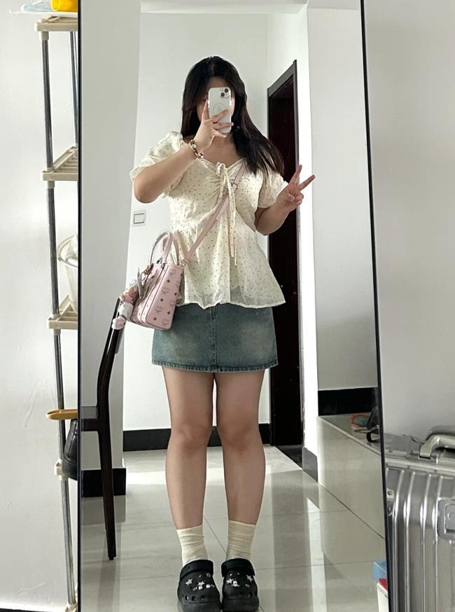 這一身看起來好乖啊,誰說胖mm穿短裙就不好看了?哪怕是配了這麼一件小上衣也完全沒有問題,配的牛仔短裙,怎麼穿都好百搭,而且還顯瘦,記得要增加一些穿搭細節,例如佩戴飾品,項鍊、手鍊等,或者是選擇一個好看的包包,都能提升造型時髦度。