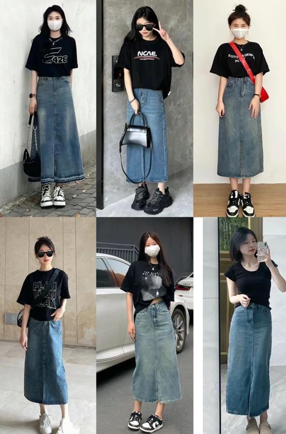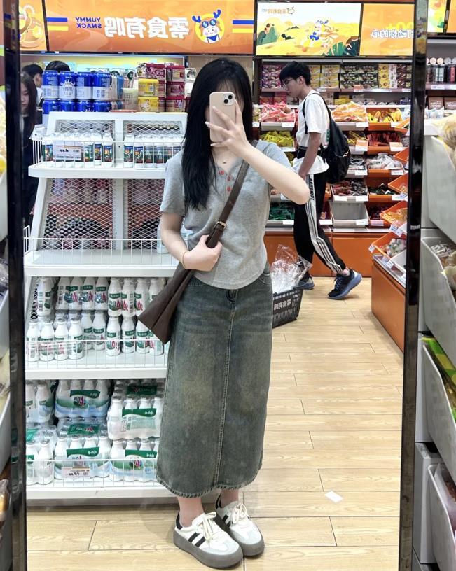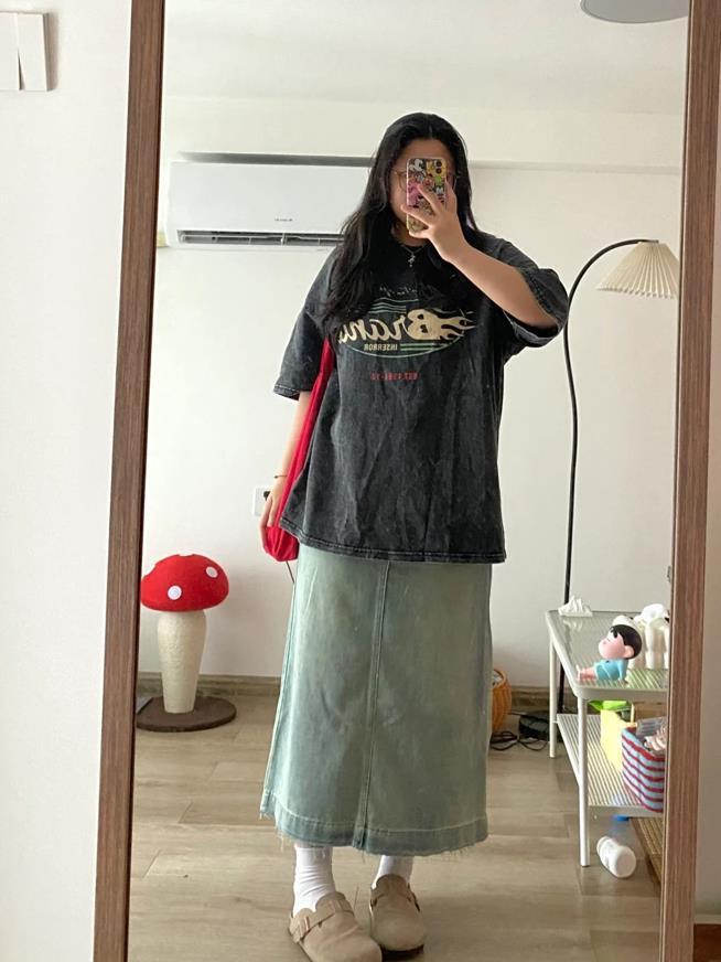 夏天的穿搭裏,又怎能沒有一條牛仔裙呢?這條牛仔中長半身裙,真的太能遮肉了,搭配灰黑色的短袖t恤,下襬沒有塞進裙子裏面,而是隨意鬆開,輕鬆打造出隨性慵懶的味道,很自在輕鬆,就這麼簡簡單單出門逛街,上班都可以。