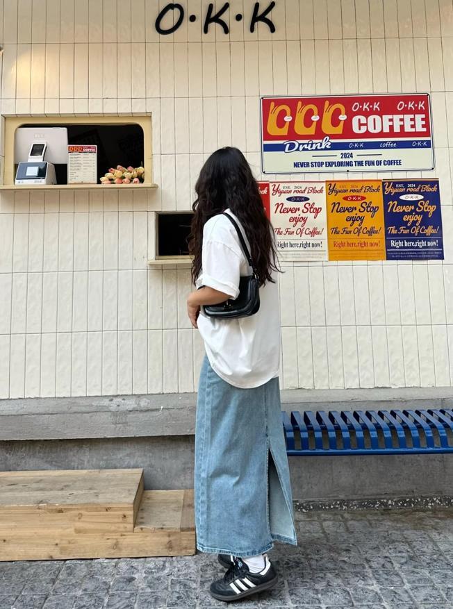微胖女生可以直接借鑑起來的牛仔裙穿搭,這一身在夏天可以直接封神了,白色寬鬆的t恤,穿起來可舒服自在了,一點約束感都沒有。搭配後開叉設計的牛仔中長裙,不會讓人覺得個子被壓矮了,搭配的黑色運動鞋和包包進行了呼應,強調了穿搭細節。