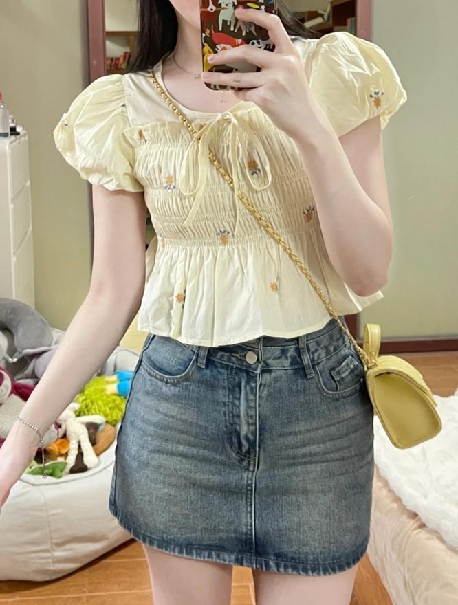甜甜乖乖女的一套,夏天這樣穿簡直不要太甜了,奶昔黃色泡泡娃娃衫,搭配淺藍色牛仔短裙,這樣的配色瞧着就很乖很甜,少女感呼之而出。泡泡袖對於手臂粗的女生相當友好,有效遮住缺點,不過肩寬的身材不建議穿。