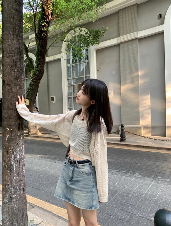 自帶慵懶感的穿搭,喜歡這種風格的姐妹們絕對不要錯過,夏日不想穿防曬衫的,可以入手這種鏤空罩衫,裏面配件黑色小背心就非常好看,還這些幾分小性感。選擇牛仔半身短裙來配,顯高挑又好看。